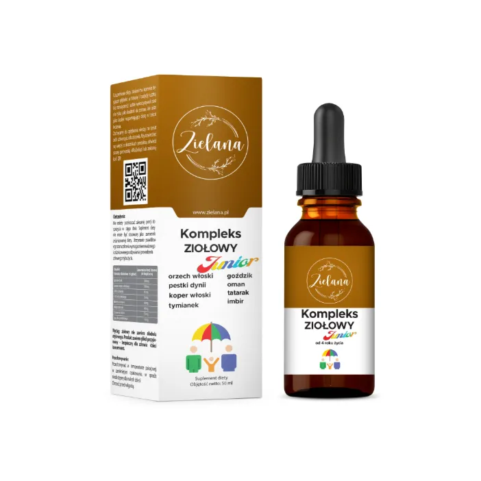 Zalety produktu Zielana Kompleks Ziołowy Junior oferuje liczne korzyści dla zdrowia dzieci: działa przeciwpasożytniczo – dzięki zawartości pestek dyni, orzecha włoskiego oraz bylicy piołunu, łagodzi dolegliwości żołądkowo-jelitowe – koper włoski, imbir i tatarak wspierają trawienie i redukują wzdęcia, działa przeciwzapalnie i wspomaga odporność – tymianek, goździk i omanu mają właściwości antybakteryjne i antyseptyczne, wspiera naturalną równowagę jelit – składniki łagodzą podrażnienia przewodu pokarmowego, delikatny dla dzieci – brak alkoholu, konserwowany glikolem propylenowym, co sprawia, że preparat jest bezpieczny od 4. roku życia, wygodne dawkowanie – 15 kropli dwa razy dziennie rozpuszczane w 100 ml wody; opakowanie 50 ml wystarcza na pierwszą 14-dniową kurację.